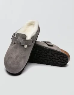 The signature slip-on clog from Birkenstock: the Boston. A casual-wear staple, perfect year round. Featuring a simple, adjustable design and contoured cork footbed that forms to the shape of the foot, the Boston is a timeless and perennial favorite. This classic model comes in an especially cozy version with genuine shearling lining the footbed and the upper. The perfect shoe for cozy winter evenings! The upper is made from soft suede.