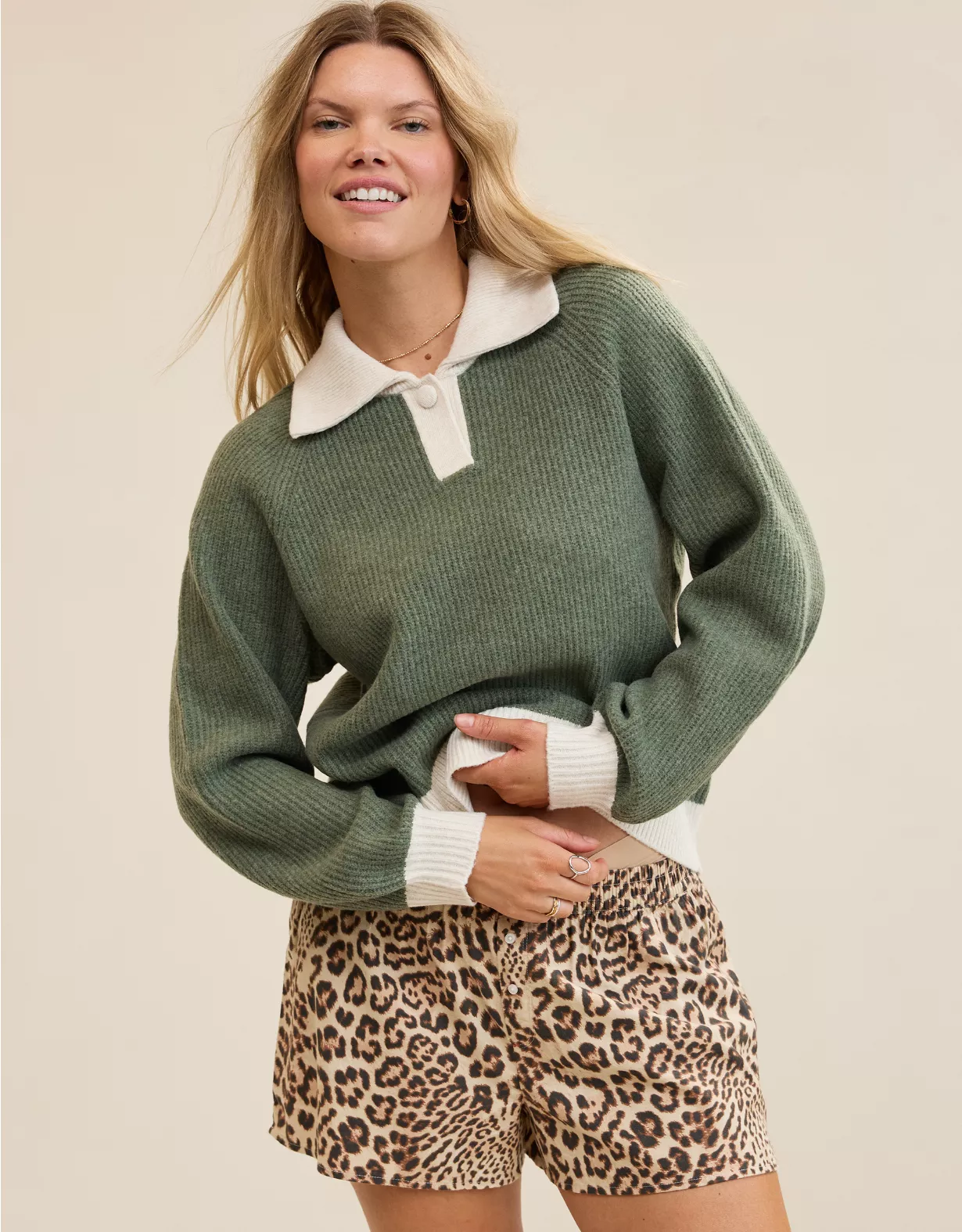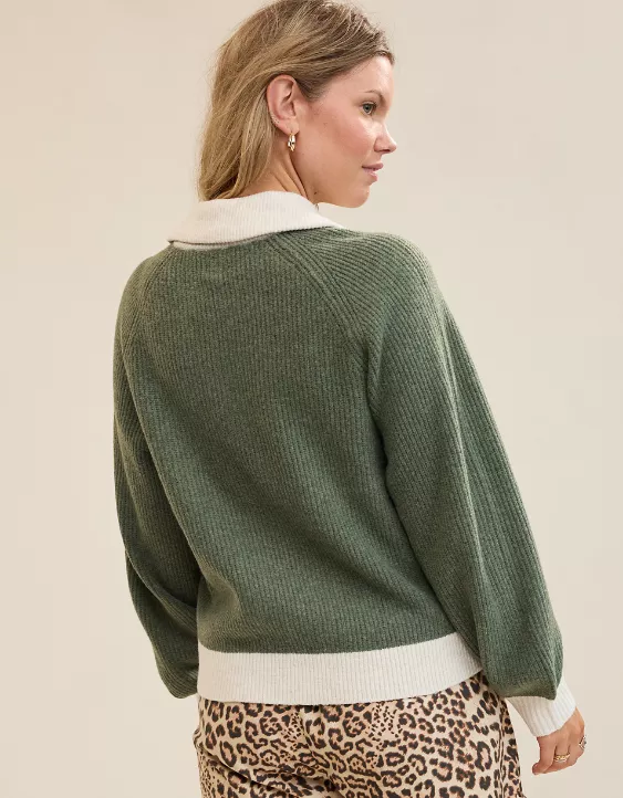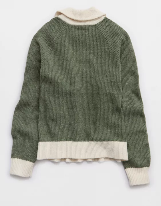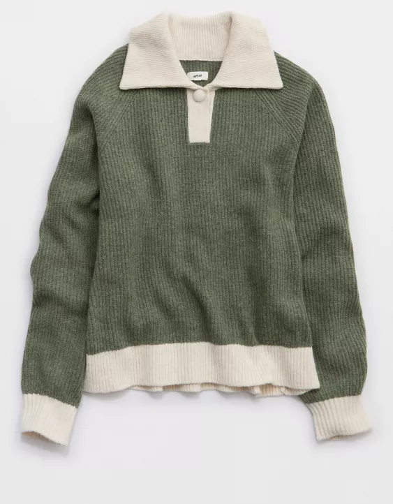 Aerie Classic Quarter Button Sweater Olive Fun