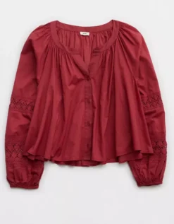 Aerie Long Sleeve Crochet Button Down Shirt Summer Burgundy