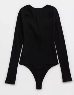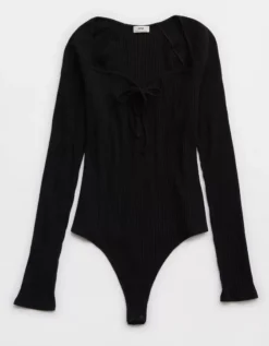 Aerie Long Sleeve Tie Front Bodysuit True Black