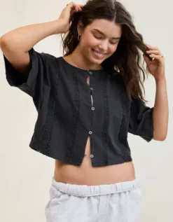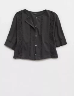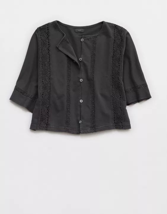 Aerie Short Sleeve Crochet Cardigan Smoked Gray