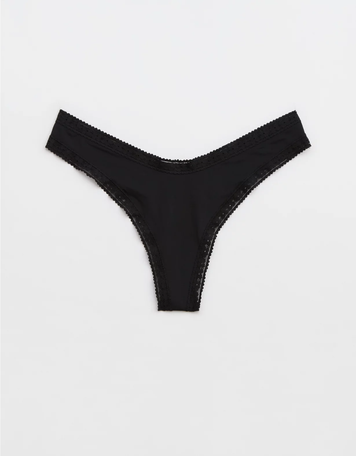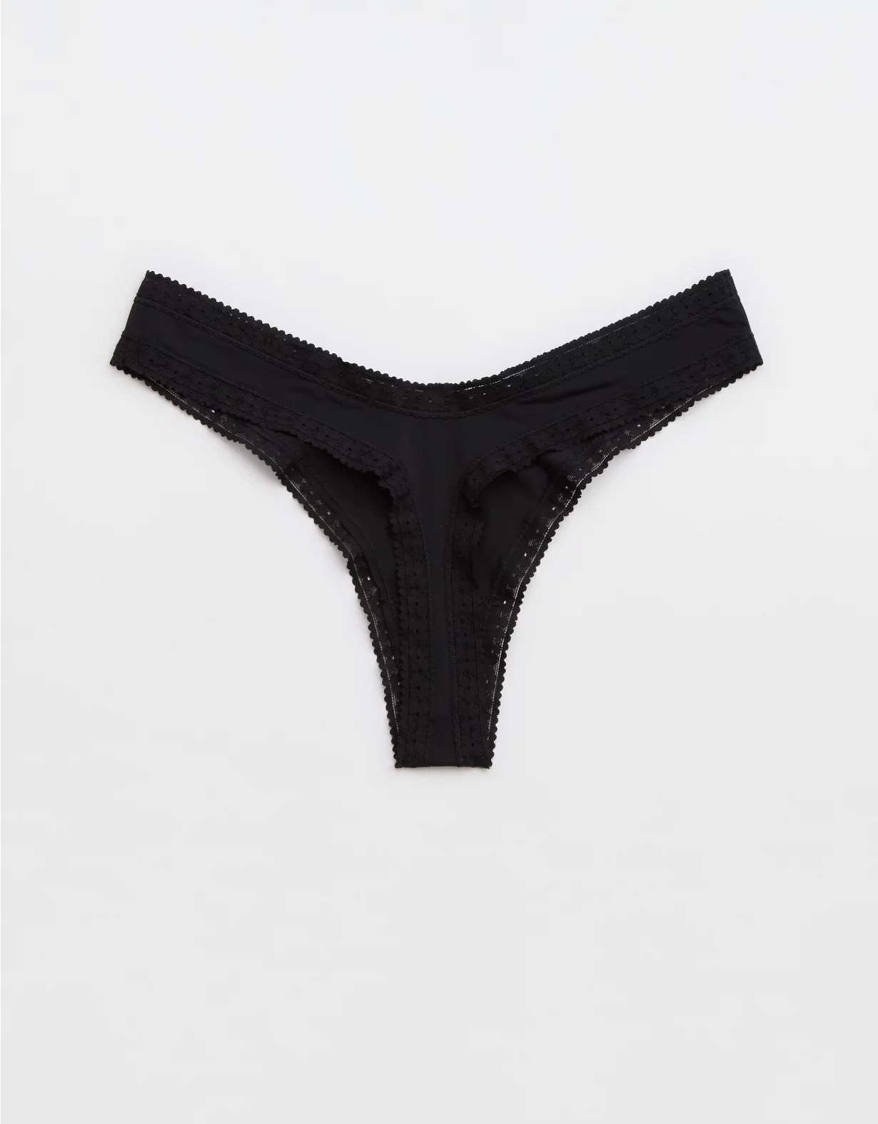 Aerie SMOOTHEZ Microfiber Lace Thong Underwear True Black