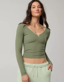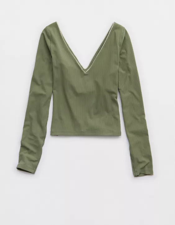 OFFLINE By Aerie Real Me XTRA Rib Open V-Neck T-Shirt Olive Fun