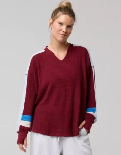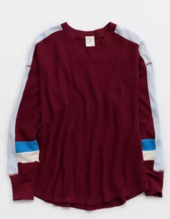 OFFLINE By Aerie Wow! Waffle Notch Neck Long Sleeve T-Shirt Deep Cherry